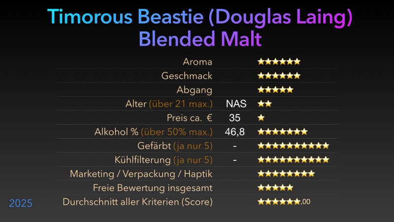 Timorous Beastie bekam seinen Namen in Anlehnung an das Gedicht "To a mouse" von Robert Burns, dem wohl berühmtesten Dichter Schottlands. Dieser Blended Malt Whisky ist eine Ode an das schottische Hochland, und so finden angeblich ausschliesslich Single Malts aus den schottischen Highlands den Weg zu diesem Mäuschen. Destillerien wie Blair Athol, Glen Garioch, The Dalmore und Glengoyne sind vertreten.