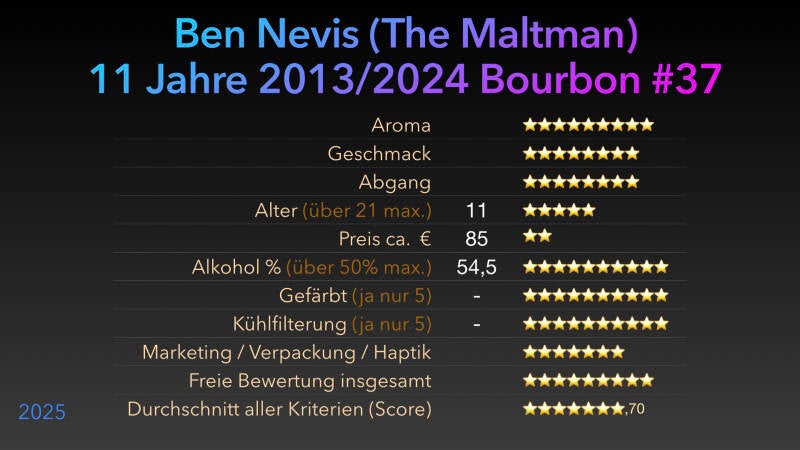 Einen weiteren Ben Nevis aus 2013 hat The Maltman in 2024 abgefüllt aus seinem Bourbon Barrel #37. Nur 240 Flaschen gehen in den Verkauf und sollen die exklusive Marke unterstreichen. Das merkt man auch am Preis, der aber noch fair ist. Das Bourbonfass liefert die klassischen süßen Vanillenoten und gelbe Frucht. Der Whisky hält im Aroma, was der Händler verspricht. Die gelbe Frucht, oder Birne mit etwas Banane kommt durch. Weiche süße Eindrücke. Er verträgt etwas Wasser. Ein Whisky für Bourbonfassfans. 💦