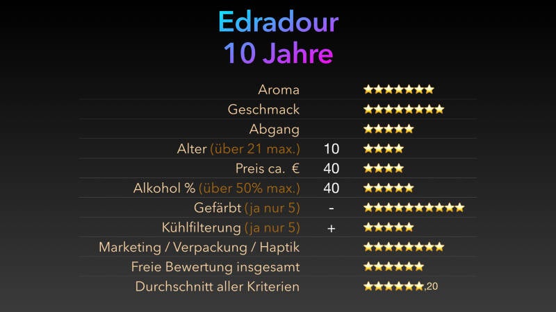 Stand 2025 wird er nun mit 43% abgefüllt, scheinbar wollen sie sich langsam rantasten. Und tatsächlich, im SWOA Interview gab Andrew Symington bekannt, dass der 10er künftig 46% haben wird. Wunderbar, Danke. Den werde ich zu gegebener Zeit neu bewerten.