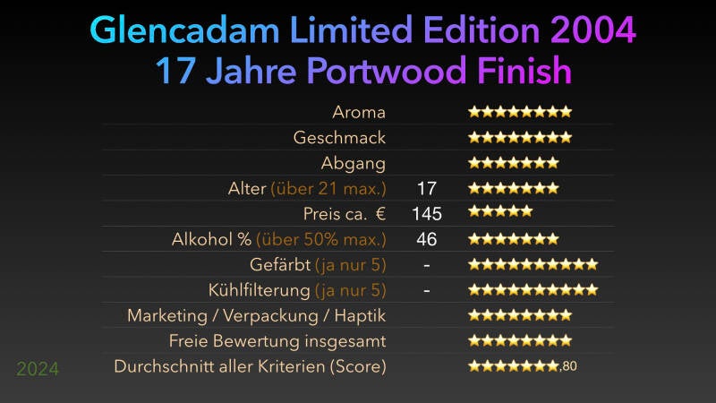 Dieser 17er kommt in einer limitierten "Edition 2004" heraus. Gereift zunächst klassisch in Bourbonfässern, danach in Portwood. Mal sehen, ob das Aroma eingekochte Früchte und Erdbeerkuchen offenbart. So kann man es in einigen Rezensionen lesen. Diese Editionen kommen regelmäßig heraus und stellen etwas Besonderes dar. Ich rieche Karamell, Weintrauben und Würze. Im Mund neben der süßen Vanille und den Weingummies etwas Würze. Der Abgang ist kräftig und wird leicht trocken. Dunkle Schokolade bleibt. Im Ergebnis ein schöner Whisky, der durch das Finish mehr in die Weinnoten geht als bei einem Sherryfinish.