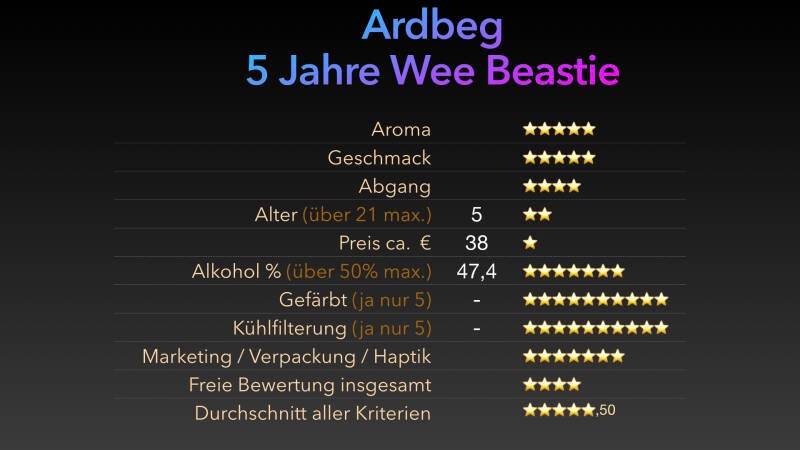 Dieses kleine Monster of Smoke kommt tatsächlich mit nur 5 Jahre in den Ring und beißt sich sogleich durch. Wer den Fehler macht und die Flasche öffnet, bekommt die "kleine Drecksau" nicht wieder in die Flasche zurück. Hier kann man Ardbeg erleben, rauchig, dreckig, bissig. Leider preislich wieder zu hoch für einen 5er. Aber handwerklich wieder sauber gemacht. Auf jeden Fall eine Erfahrung, die man nicht versäumen sollte.