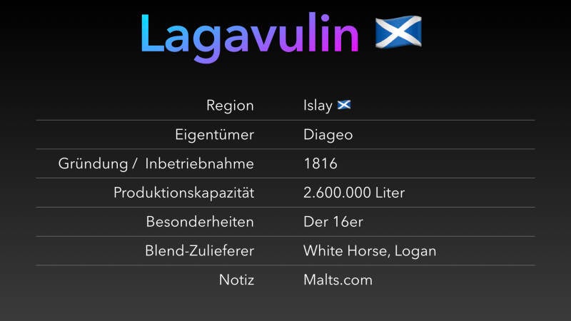 Lagavulin, die "Mulde der Mühle", ist eine weitere Diageo Brennerei auf Islay, die rauchigen Whisky produziert. Die Standardbottles werden wegen der Anordnung der teilweise abgerundeten Etiketten trotzdem sofort wahrgenommen. Einer davon steht immer irgendwo in einem Whiskyregal. Das früher auf den 16er beschränkte Sortiment ist ausgebaut, es beinhaltet auch eine Destillers Edition.
