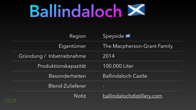 Eine relativ neue kleine Familiendestillerie auf dem Sitz des Ballindaloch Castle. Sie folgen dem Grundsatz, alles aus einer Hand zu machen, also vom Anbau der Gerste bis zur Abfüllung am Standort. Sie haben sich Zeit gelassen, nicht gleich einen 3er rausgebracht, sondern fertige Abfüllungen. In Deutschland sind Stand 2024 zwei Abfüllungen zu haben, ein 8er und ein 9er mit über 60% ABV. Guter Anfang. Die Preise sind gehoben, aber im Verhältnis zur Menge nicht übertrieben, wenn man so manchen Konzern zum Vergleich nimmt, die Massenware mit viel Schnickschnack teuer vermarkten.